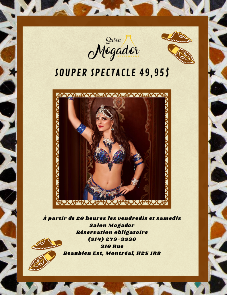 Tous les vendredis et samedis, le Salon Mogador présente un spectacle des danseuses professionnelles de baladi dans une ambiance agréable. Possibilité de réserver le spectacle pour les autres jours de la semaine.